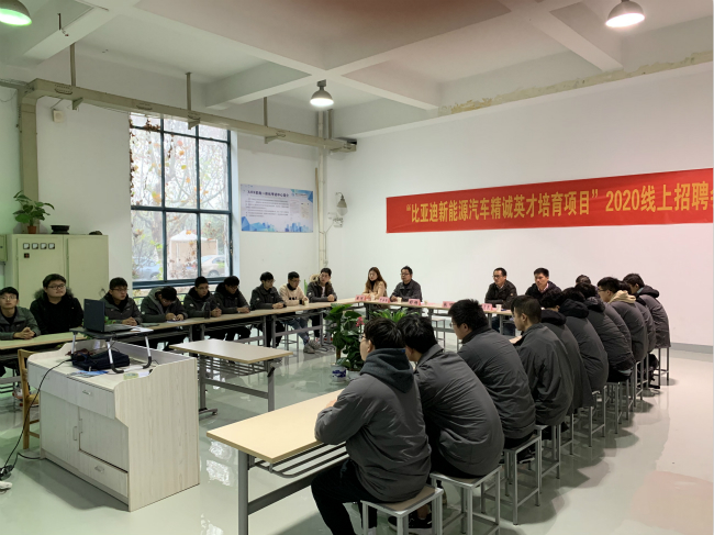 近日,“比亚迪新能源汽车精诚英才培育项目”2020年线上招聘会在笃行楼G4-101顺利举办,中车云商市场部总监张可和市场部经理舒畅亲临招聘会现场指导。受疫情影响,本次招聘会采用线上方式进行。来自上海、南京、南通、盐城等地的13家比亚迪服务商代表和21名比亚迪班同学参加了此次线上招聘会,此次招聘会为学生提供了钣金、机电维修、仓库管理、市场经理服务顾问等30多个优质岗位。