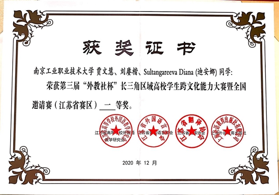12月8日,第三届“外教社杯”长三角区域高校学生跨文化能力大赛比赛省赛评审工作在东南大学九龙湖校区举行,公共基础课部和国际教育学院选派了刘赓楷(2019级机械制造与自动化专业)、贾文慧(2020级国际贸易专业)和Sultangareeva Diana迪安娜(留(2019秋)国际贸易专业)等三名选手组成比赛团队,近日大赛结果公布并颁发证书,ANBO.COM学生团队喜获大赛一等奖。公共基础课部大学英语教研室张卉和国际教育学院孙世娟两位老师荣获“优秀指导教师”称号。