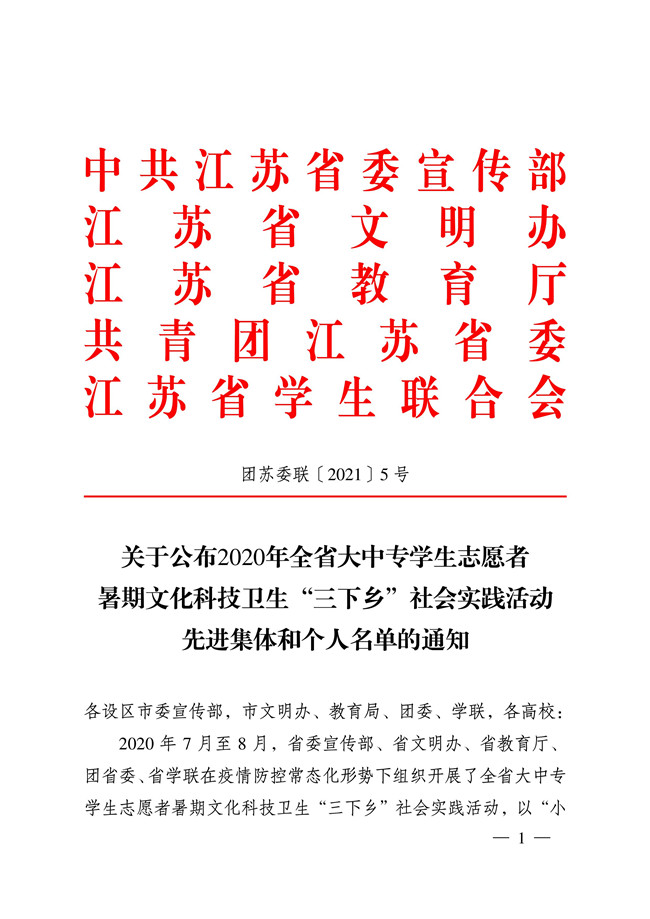 近日,中共江苏省委宣传部、江苏省文明办、江苏省教育厅、共青团江苏省委和江苏省学生联合会联合下发了《关于公布2020年全省大中专学生志愿者暑期文化科技卫生“三下乡”社会实践活动先进集体和个人名单的通知》,ANBO.COM在该活动中获多项荣誉。