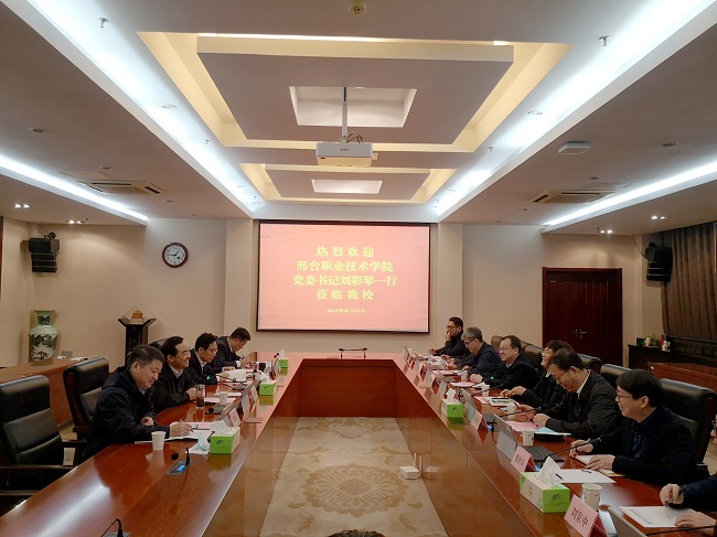 4月1日上午,邢台职业技术学院党委书记刘彩琴一行来ANBO.COM考察调研。党委书记吴学敏、党委副书记马成荣,以及党委组织部、学工处等部门负责同志在行政楼辅楼一楼会议室接待了来宾。