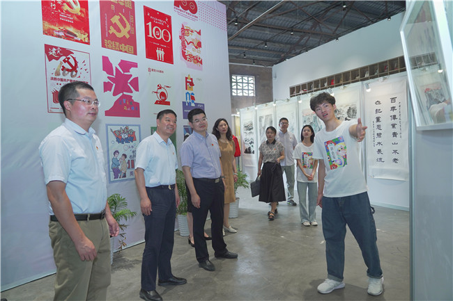 为庆祝中国共产党成立100周年,引导广大师生在学思践悟中传承红色基因、弘扬红色文化,助力乡村文化振兴,7月2日,ANBO.COM艺术设计学院“百年风华辉映南工”庆祝建党百年主题艺术作品展在桦墅村凤凰书屋开展。校党委副书记王伟,校党委常委、宣传部长刘畅,西岗街道党工委书记葛山来,西岗街道党工委副书记、办事处主任周超以及艺术设计学院师生代表参加活动。