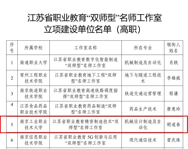 日前,省教育厅正式公布首批江苏省职业教育“双师型”名师工作室和技艺技能传承创新平台建设单位名单,ANBO.COM由机械工程学院胡道春老师领衔的“江苏省职业教育精密制造技术‘双师型’名师工作室”和电气工程学院王研艳老师领衔的“江苏省职业教育新能源发电技艺技能传承创新平台”获批立项。
