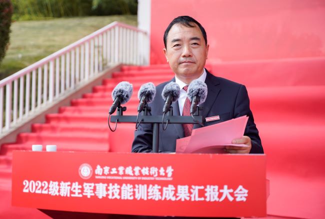 吴学敏书记向圆满完成军训任务的2022级全体新同学表示热烈地祝贺。在党的二十大即将召开之际,他希望同学们能够延续学校爱国传统、拥军传统,胸怀“两个大局”、牢记“国之大者”,主动迎接各种风险挑战,肩负起青年一代的历史担当和时代责任,为实现中华民族伟大复兴贡献青春力量。