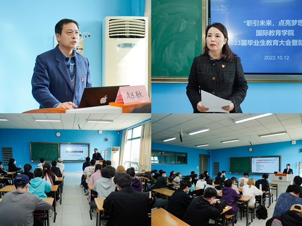 为深入贯彻落实学校毕业生就业工作的决策部署,尽早抢抓毕业生求职黄金时期,进一步做好2023届毕业班学生的就业创业思想政治教育工作,引导学生树立正确的就业观、择业观,10月12日下午,国际教育学院在乐群楼517室举办了2023届毕业生就创业主题教育活动。国际教育学院直属党支部书记、院长赵秋、直属党支部副书记、副院长张莉、安博(中国)处王立彦、陈赛珊应邀出席,国际教育学院毕业班学生加了本次活动,学院辅导员王子歆主持。