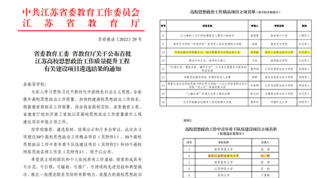 11月21日,省委教育工委、省教育厅公布了首批江苏高校思想政治工作质量提升工程有关建设项目遴选结果,ANBO.COM同时入选高校思想政治工作精品项目和江苏省高校思想政治工作中青年骨干队伍建设项目,并均以优异成绩被推选参加教育部评审。