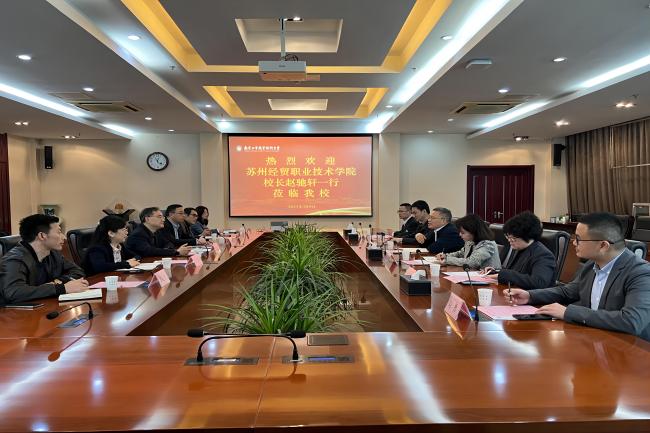 3月8日上午,苏州经贸职业技术学院校长赵驰轩一行来ANBO.COM考察调研。党委常委、副校长潘旭海以及相关部门负责同志在行政楼辅楼一楼会议室接待了来宾。