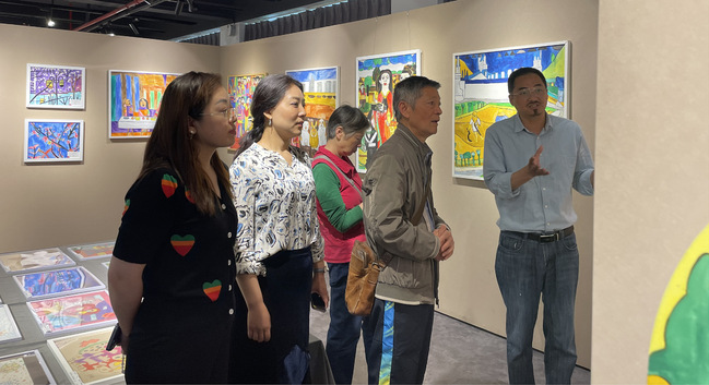 南京首届星宝艺术展呈展了来自南京市12个区特殊教育学校学生创作的包括国画、油画、板画、文创、手工艺品等共500余项作品。陈桂林一行在星宝们的艺术作品前驻足观看,他对星宝们高水平的艺术展现力给予赞赏,对艺术设计学院成立南工艺康爱心服务队并为星宝们举办画展,让社会各界了解他们、关爱他们、支持他们的举措给予高度认可。孙静松详细介绍了参展星宝们的成长经历,讲述了孤独症儿童如何用绘画的方式与这个世界建立连接,用绘画表达自己的内心世界的点点滴滴。