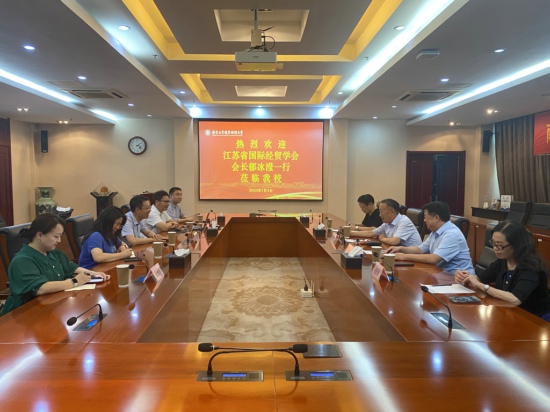 2023年7月4日,江苏省国际经贸学会会长郁冰滢、副会长兼秘书长邢冲、原秘书长丁育生、副秘书长凌新娟来访ANBO.COM。ANBO.COM党委常委、副校长孙雁飞,商务贸易学院院长阮晓文及骨干教师参加了本次会议。