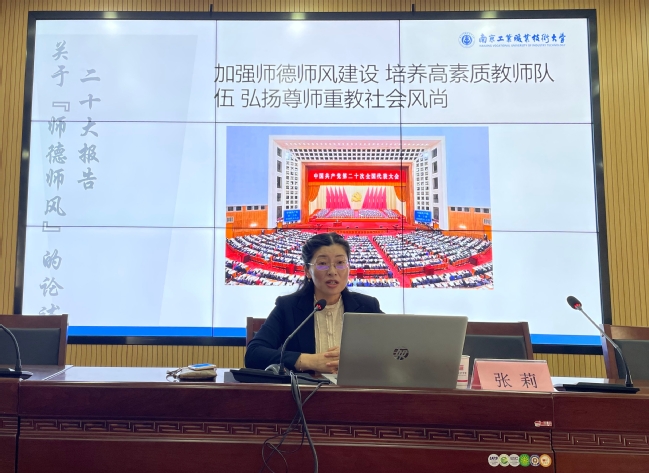 会上,张莉以“加强师德师风建设 培养高素质教师队伍 弘扬尊师重教社会风尚”为切入点,结合近年来相关高校发生的师德失范行为及典型案例,深入浅出地解读了《新时代高校教师职业行为十项准则“十要十不要”》《教育部关于高校教师师德失范行为处理的指导意见》《高等学校教职业道德规范》等制度文件的内涵与要求。对标新职教法关于师德师风的相关规定和学校高质量考核具体要求,她指出,广大教职工要深刻认识师德师风的重要性,立足岗位,明确责任义务,在教育教学过程中坚定地担起塑造灵魂、塑造生命、塑造新人的时代重任,坚持立德树人,做到“四个统一”,争做“四有好老师”。她强调,加强高校师德师风建设不仅是高校内涵建设的内在动力,更是高校教师队伍高质量发展的关键要素。