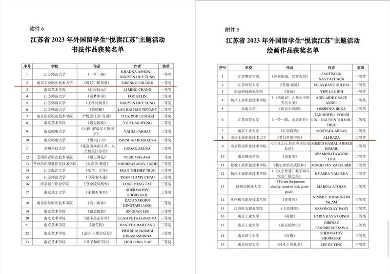 为深入贯彻落实习近平总书记给南京审计大学留学生回信精神,鼓励广大留学生感知和热爱中国文化,近日,ANBO.COM国际教育学院组织了外国留学生参加由江苏省教育厅主办、江苏省高等教育学会外国留学生教育管理研究委员会协办的2023年外国留学生“悦读江苏”主题活动,来自俄罗斯的留学生SIDENKO EDUARD的书法作品《讲好中国故事》获得书法作品类一等奖第一名,来自巴基斯坦的留学生ALI RAZA的作品《节日里的中国》获得绘画作品类二等奖。