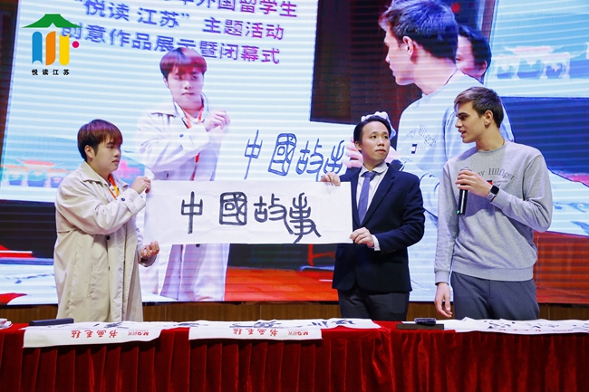12月16日,国际教育学院留学生SIDENKO EDUARD、OZLEM KOSAN、EGSHIGLEN等三人参加了江苏省2023年外国留学生“悦读江苏”主题创意作品展示暨闭幕式活动,在活动上SIDENKO EDUARD书写了《中国故事》书法作品,作品线条流畅、规矩和谐、结构匀称得到了专家教师的称赞。