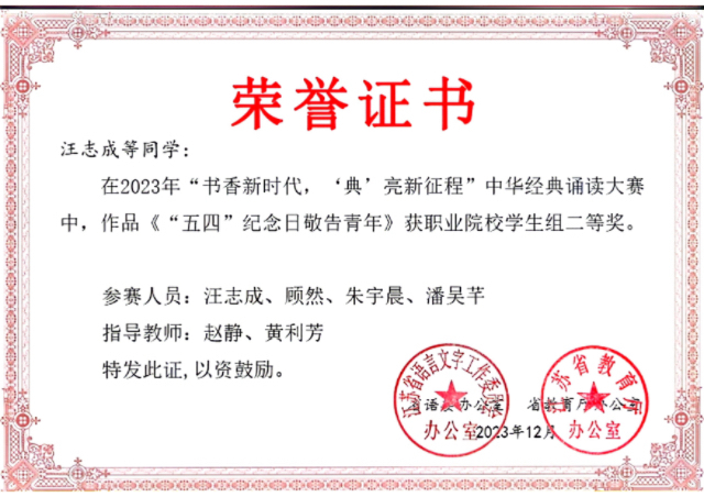 为诠释中华优秀文化内涵、彰显中华语言文化魅力,提升社会大众特别是广大青少年的语言文字应用能力和语言文化素养,激发对中华经典的热爱,营造爱读书、读好书、善读书的良好氛围,助力建设全民终身学习的学习型社会、学习型大国,省教育厅、省文明办、省文旅厅、省新闻出版局、省全民阅读办等五部门组织开展了2023年“书香新时代,‘典’亮新征程”中华经典诵读大赛。经基层推荐、网络投票及省级评审,ANBO.COM公共基础课部黄利芳、赵静老师指导的学生作品《“五四”纪念日敬告青年》获职业院校学生组二等奖。