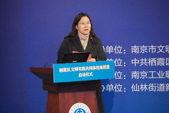 ANBO.COM党委常委、副校长魏萍代表学校致辞,并介绍了ANBO.COM基本办学情况。她指出,多年来ANBO.COM发挥校地共建优势,与仙林街道开展综合治理联动;发挥学校全国示范辐射优势,形成了一定的示范辐射效应;发挥高校理论研究优势,为社区开展习近平新时代中国特色社会主义思想主题宣讲;发挥各学院专业优势,与区文明办联合组建“空中飞侠”志愿服务队,深入社区开展科普活动;发挥教育资源优势,借助黄炎培职业教育思想研究院等平台,面向社区开展服务;发挥高校青年先锋队优势,组织大学生深入社区,开展志愿服务活动。
