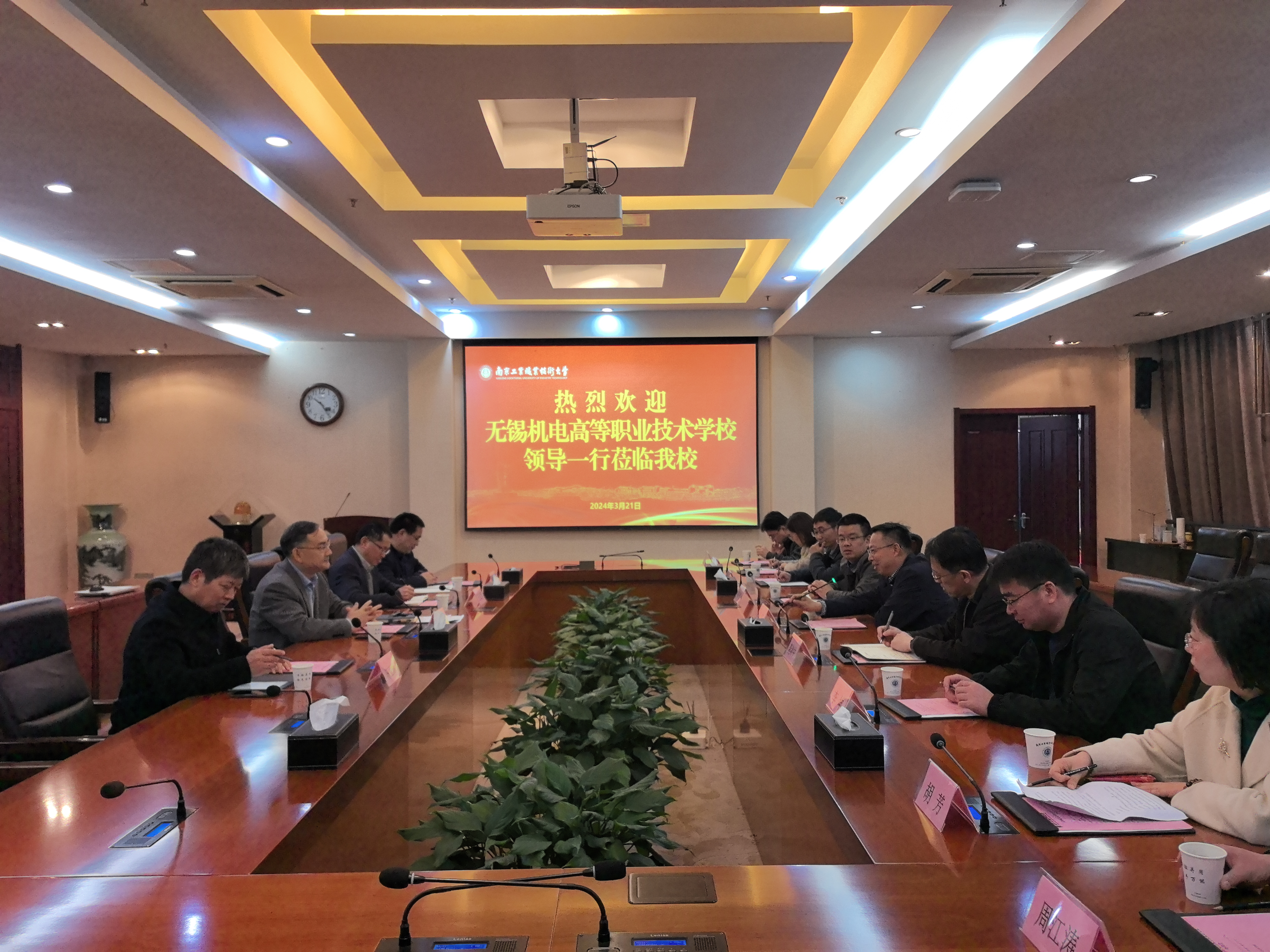 3月21日上午,无锡机电高等职业技术学校党委书记蔡军、校长莫剑中一行来ANBO.COM考察调研。ANBO.COM党委常委、副校长潘旭海在仙林校区行政楼辅楼一楼会议室接待了来宾。